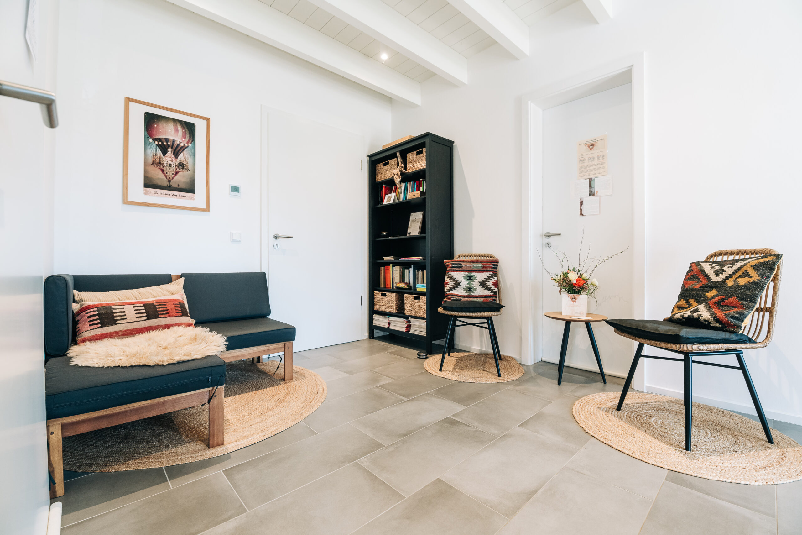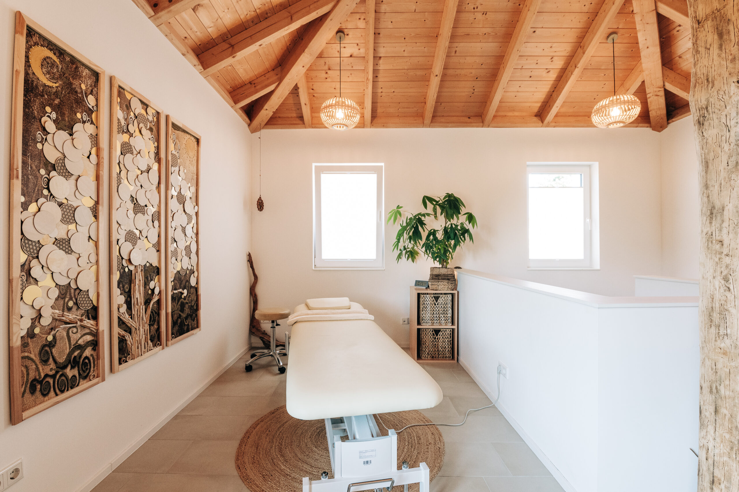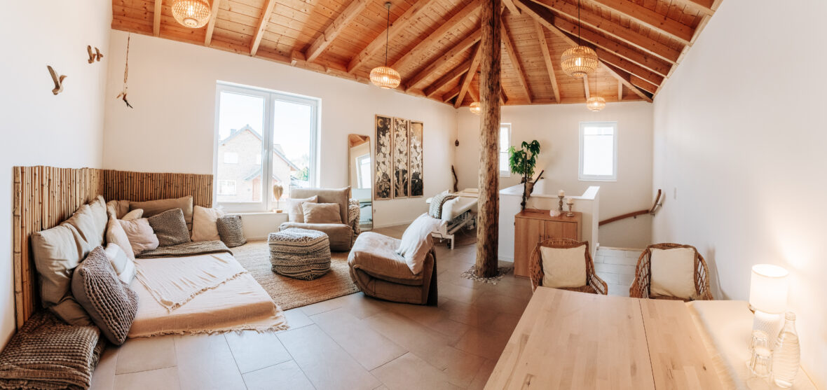 Der gemütliche Behandlungs- und Beratungsraum im Obergeschoss bietet nicht nur ausreichend Platz, sondern auch verschiedene Funktionsecken für eine gelungene Praxisarbeit. Unter der Woche werden hier unter anderem systemisches Coaching, Schwangerschaftsbegleitungen, Stillberatungen und Massagen angeboten. Bei Tages- oder Wochenendveranstaltungen besteht zudem die attraktive Möglichkeit, diesen Raum in einen zweiten Gemeinschaftsraum umzugestalten. Im Rahmen verschiedener Events wird er dann beispielsweise als Pausen- oder Meditationsraum genutzt.